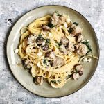 Bereid de spaghetti volgens de instructies op de verpakking. Verhit de olijfolie in een koekenpan en bak de stukjes worst rondom goudbruin. Voeg de ui en champignons toe en bak een paar minuutjes tot deze zacht zijn. Voeg de laatste minuut de peterselie toe.Kluts de eieren in een kom samen met de helft van de Parmezaan. Haal de pan van het vuur en roer de spaghetti door de groenten. Voeg vervolgens het ei toe en schep een minuutje om, zodat de ei langzaam gaart. Breng op smaak met peper en zout.