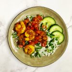 Kook de rijst volgens de instructies op de verpakking. Kook de snijbonen mee met de rijst. Verhit de olijfolie in de pan en bak de garnalen een paar minuten. Voeg de paprika toe en bak een paar minuten mee. Voeg de kerriepoeder, mangochutney en limoenrasp & sap toe. Breng op smaak met zout en peper. Serveer met de rijst, sojasaus en komkommer.