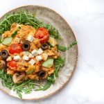 Meng in een kom de couscous met de saucijzen, champignons, pesto, komkommer, cherrytomaatjes, olijven, fetakaas, rucola en breng op smaak met zout en peper. Serveer.