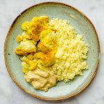 Verwarm de oven voor op 220 graden. Doe de bloemkool in een ovenschaal en meng met de olijfolie, kerriepoeder, zout en peper. Zet de ovenschaal 25 minuten in de oven. Bereid ondertussen de couscous volgens de instructies op de verpakking. Serveer de couscous met de hummus en bloemkool.