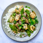 Kook de rijst gaar volgens de instructies op de verpakking. Verhit de olie in een pan en bak de biefstukpuntjes goudbruin op hoog vuur. Voeg de champignons en peultjes toe en bak 5 minuten mee. Voeg de sojasaus en alle kruiden toe. Roer de lente-ui er doorheen. Serveer met de rijst.